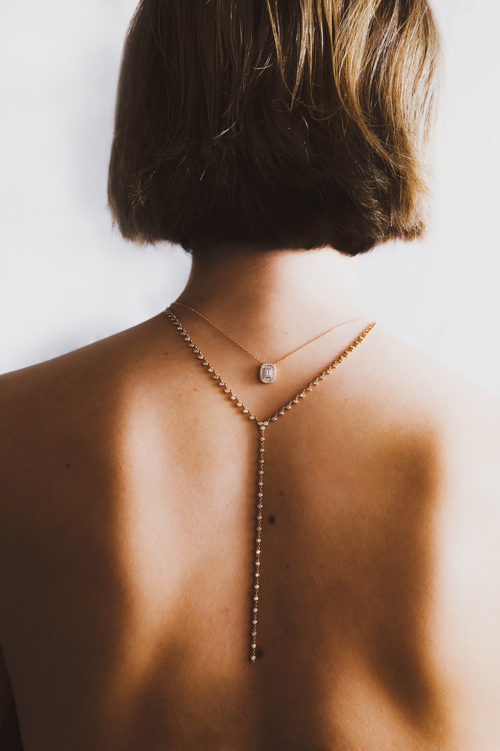 Crafted with 18K gold, our Moon necklace is set with diamonds totalling 0.57 carats, including the center stone - a baguette diamond of 0.31 carats of colour G and clarity VS.