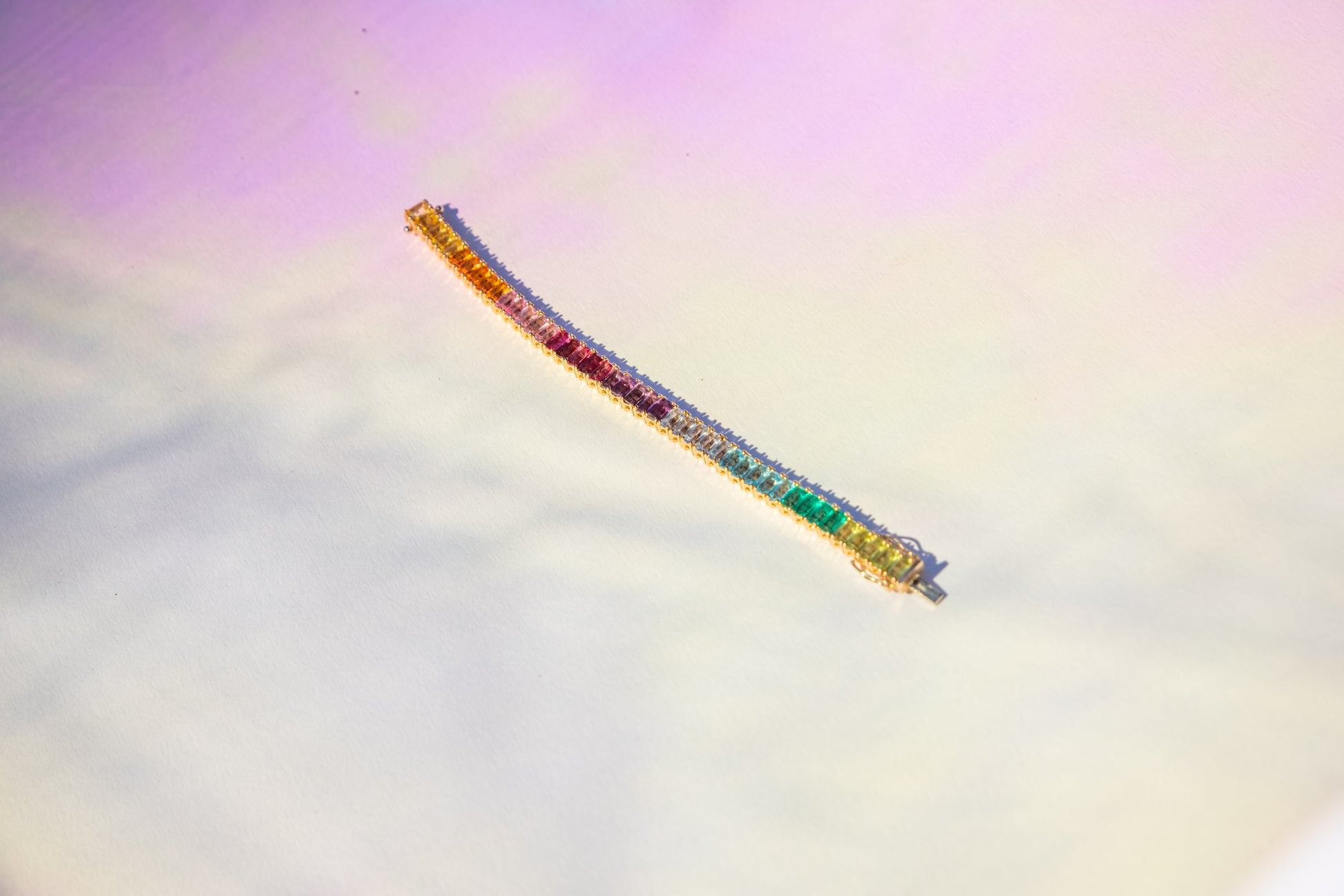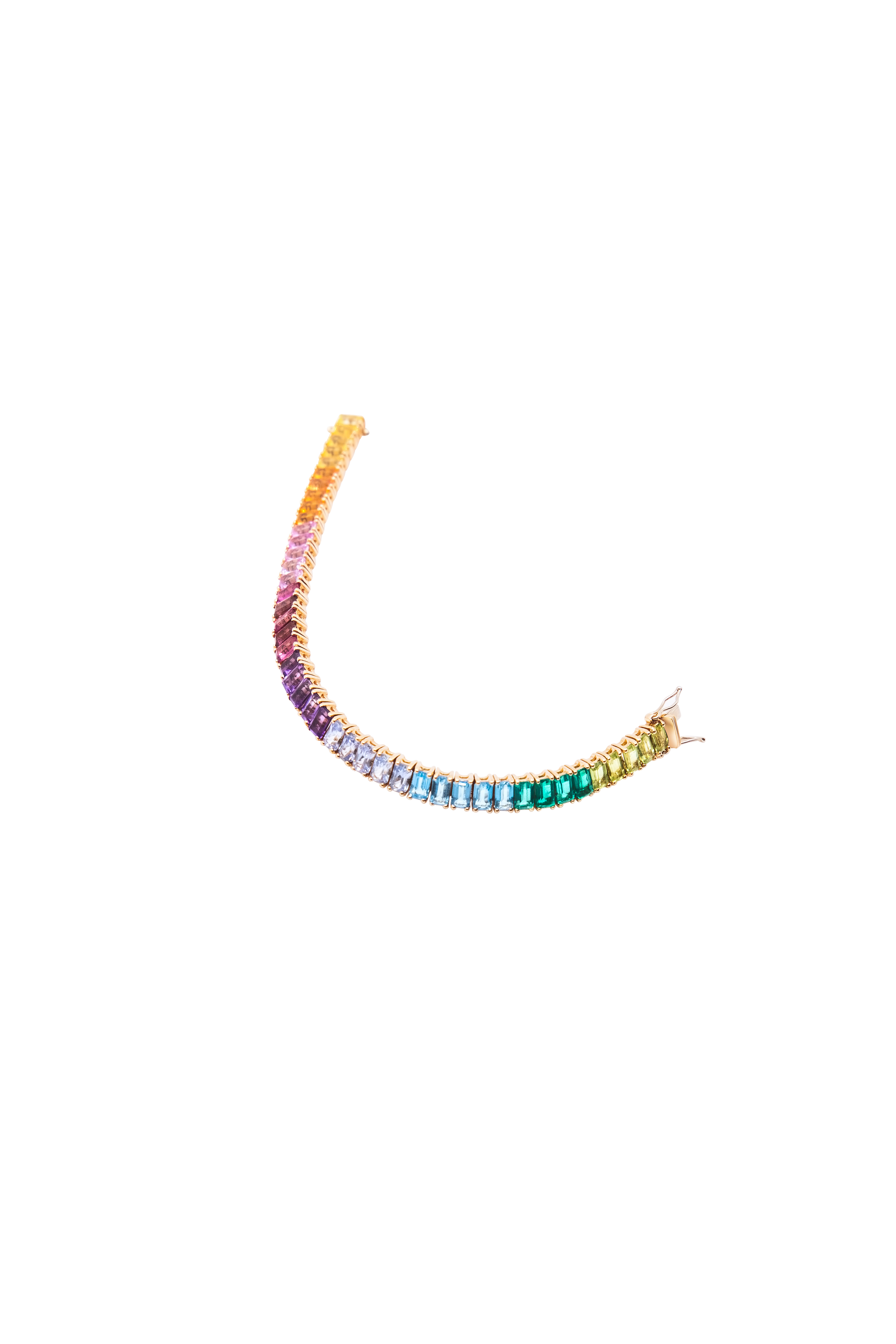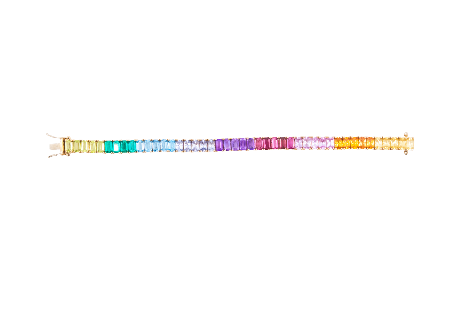 Our Tones bracelet is set with the following precious stones: Yellow Sapphire, Orange Sapphire, Pink Sapphire, Pink Tourmaline, Amethyst, Baby Blue Sapphire, Swiss Blue Topaz, Brazolite, and Peridot.
