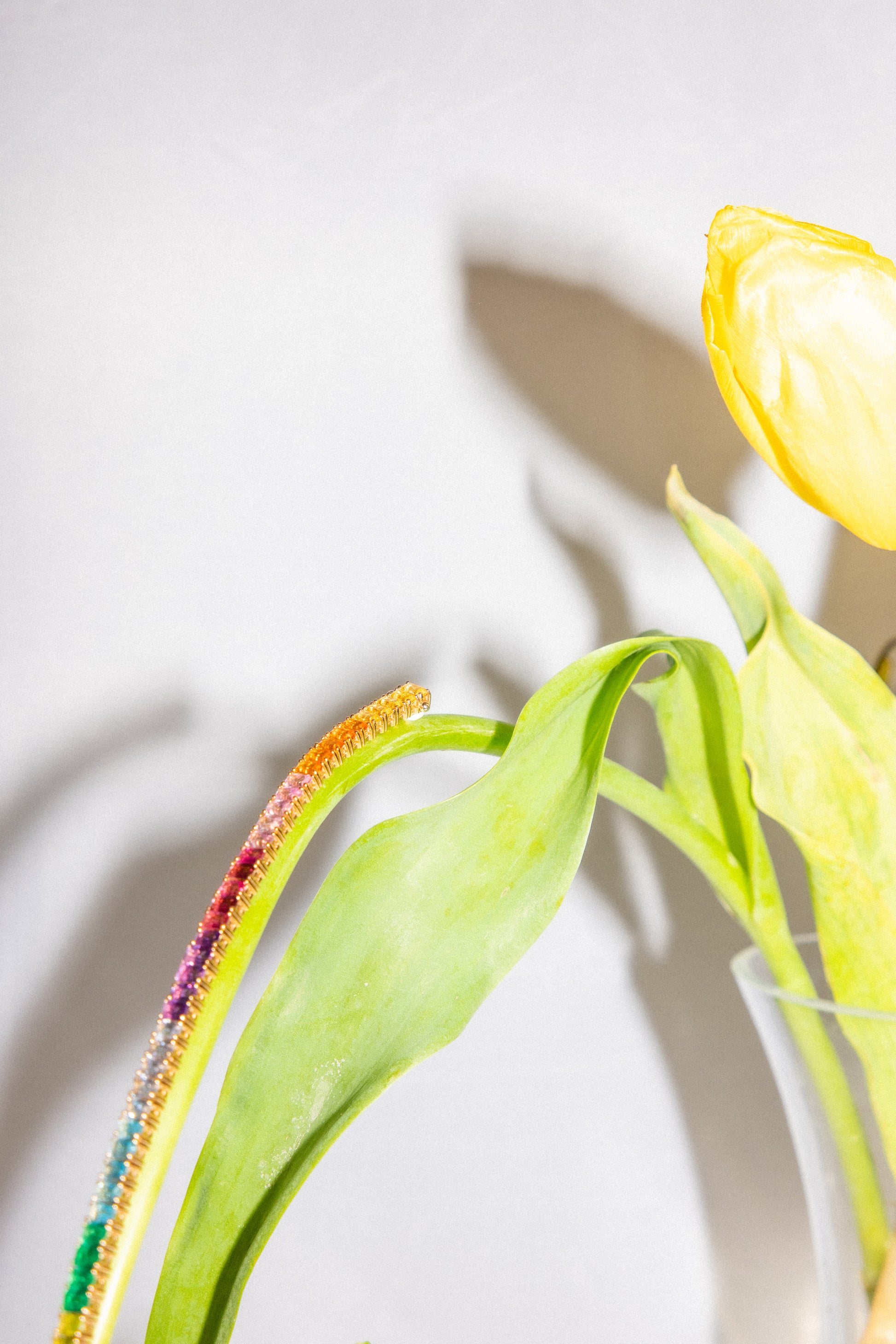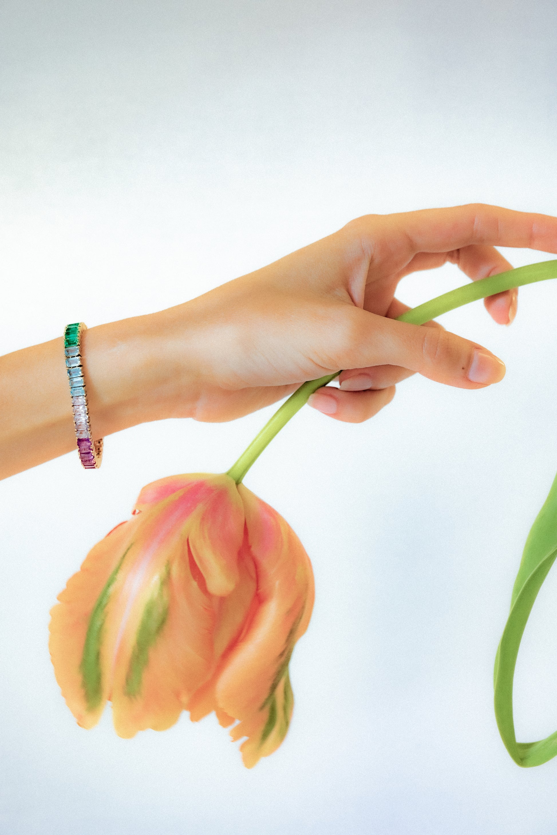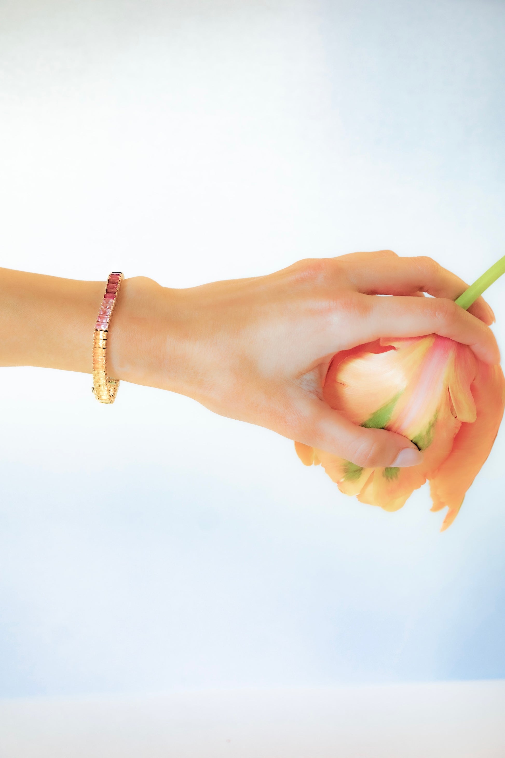 Our Tones bracelet is set with the following precious stones: Yellow Sapphire, Orange Sapphire, Pink Sapphire, Pink Tourmaline, Amethyst, Baby Blue Sapphire, Swiss Blue Topaz, Brazolite, and Peridot.